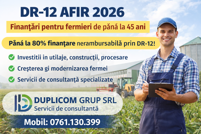 🚜 DR-12 AFIR 2026 – Finanțări pentru fermieri de până la 45 ani Investește în dezvoltarea fermei tale cu sprijin nerambursabil! Agenția pentru Finanțarea Investițiilor Rurale (AFIR) a publicat versiunea consultativă a Ghidului Solicitantului pentru intervenția DR-12 – „Investiții în…
